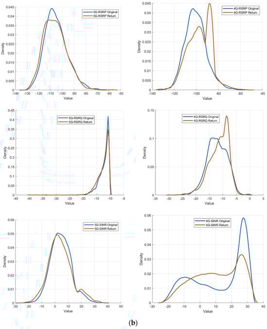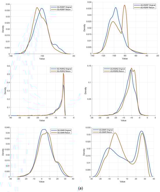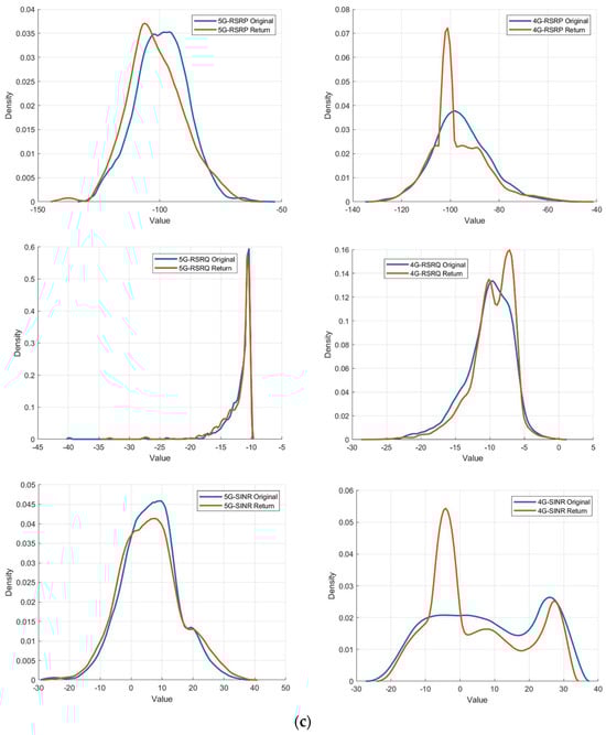 The behavior of the three networks is now further investigated by considering the distributions of the RSRP, RSRQ, and SINR, using the KDE approach, as outlined above. The results of this analysis are presented in the plots of Figure 6.