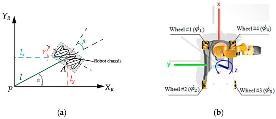 According to the theory of kinematics of the Swedish wheel [25], and considering the fact that the axes of the four wheels are perpendicular to PXR, then using the notations in Figure 3a, it is possible to express the angle and the length :