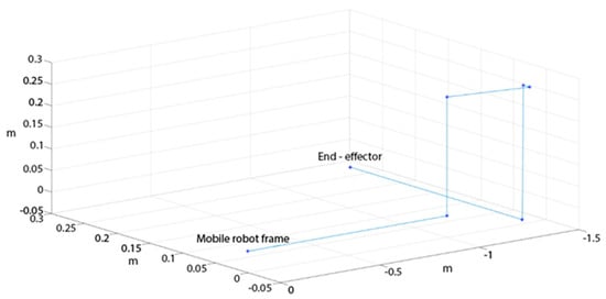 The values of are instantaneous. Since the investigated mobile manipulator has only rotational joints, we can use (69) and (71) to calculate the Jacobian. The output will be a vector with velocities in the Cartesian space, while the input values are the velocities of the manipulator’s joints . As the values of and were previously saved, we will use them to calculate for each instance. The calculation of the Jacobian is performed in steps; in each step, the algorithm calculates a column of the matrix .