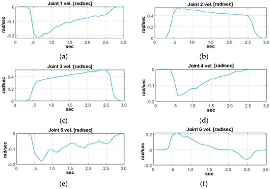 Joint velocities: (a) velocity of the first joint; (b) velocity of the second joint; (c) velocity of the third joint; (d) velocity of the fourth joint; (e) velocity of the fifth joint; (f) velocity of the sixth joint.