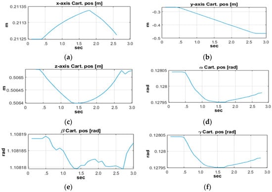 Measured positions and orientations of the end-effector. There are 3 positions and 3 orientations according to the manipulator’s base (Cartesian) coordinate system: (a) position along the axis; (b) position along the axis; (c) position along the axis; (d) orientation around the axis—; (e) orientation around the axis—; (f) orientation around the axis—.