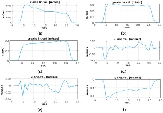 Calculated velocities according to the manipulator’s base coordinate system, along each axis and around each axis. These velocities applied to the base provide constant position of the end-effector during its movement according to the adjusted joint velocities vector : (a) velocity along the axis; (b) velocity along the axis; (c) velocity along the axis; (d) velocity around the axis; (e) velocity around the axis; (f) velocity around the axis.