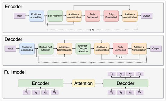 The new transformer model paradigm changes the more traditional approach of recurrent neural networks (RNN) by adopting an encoder-decoder framework and changing the fundamental mechanisms underlying the information propagation and context modeling [32]. Within this architecture, the encoder module takes on the role of processing time series data, through interconnected layers, to obtain the sequential patterns. The input layer receives the raw temporal data, and the encoder organizes the interaction between the components, including a positional encoding layer, a self-attention mechanism, normalization layers, and fully connected layers. To define all these layers, a series of parameters has been established.