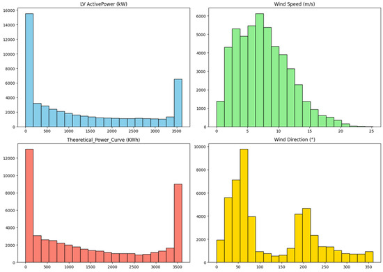 To give a better explanation of the dataset, histograms of the wind speed, theoretical power curve, active power, and wind direction are shown in Figure 5, and the main parameters are summarized in Table 2.