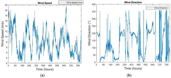 Wind speed (a) and wind direction (b) signals used to test the models.