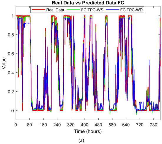 In Figure 7, the actual and predicted powers obtained for the machine learning methodologies are presented. The real data are shown in red, the predictions made with configuration 1 in green, and the predictions made with configuration 2 in blue. The input features in configuration 1 are the theoretical power curve (TPC) and the wind direction (WD). In configuration 2, the wind velocity (WS) is used instead of the wind direction.