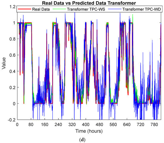 (a) Real data vs. predicted data comparison with fully connected model. (b) Real data vs. predicted data comparison with CNN model. (c) Real data vs. predicted data comparison with GRU model. (d) Real data vs predicted data comparison with transformers model.