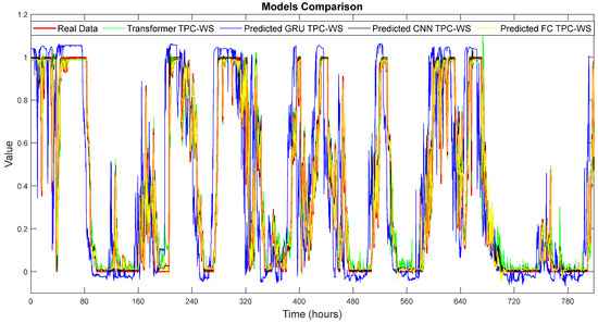 The results of the optimal configuration of each deep learning architecture are presented in Figure 8 in order to facilitate a more comprehensive comparison between the methods. In this figure, it is possible to observe that the CNN and transformers models are the models that best fit the target signal, and the GRU model is the worst.