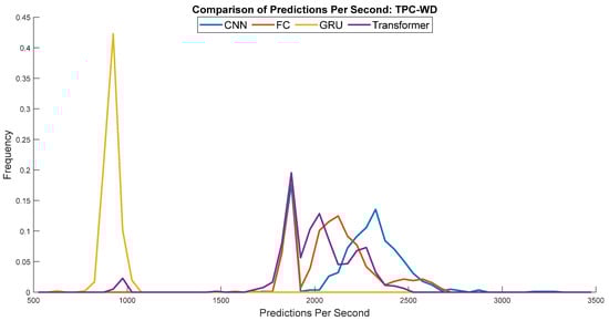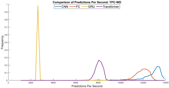 As the number of predictions per second varies during the one-hour experiment, Figure 10 and Figure 11 present the prediction speeds of the different methodologies. This detailed analysis highlights not only the raw computational power but also the real-world applicability of these methods for real-time data processing. Despite occasional drops in prediction speed, the slowest speed observed was 450 predictions per second with the least favorable scenario (GRU architecture on Raspberry Pi), which means one prediction every two milliseconds, a value that is negligible for a typical 100 ms control cycle, which is typically used in the control of small wind turbines.