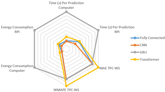 To summarize the main findings of this study, Figure 12 presents a comparative graph of the most relevant metrics for the four ML forecasting techniques and the two platforms, the standard computer and RPI. These results have been normalized to the range [0, 1], where lower values indicate better performance. This figure shows that, although they all have advantages and disadvantages regarding speed and resource use, in terms of energy consumption and prediction speed, the GRU technique lags behind in efficiency. The MAE and WMAPE errors are not very different between the different models, so all of these values in the graph are very similar. In view of these results, if we had to select a model, we would choose the CNN model for its lower consumption, speed, and good precision.