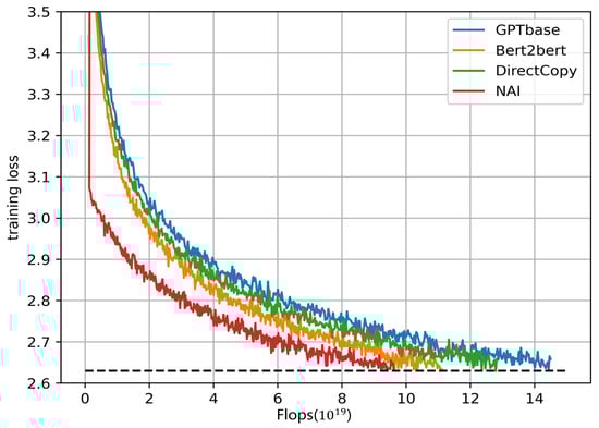 Another relevant topic is reusable neural networks, which is closely related to transfer learning [24] and has primarily been explored in the field of computer vision. Net2Net [14] is a seminal work in this area, which introduces the concept of function-preserving transformations to enable the reuse of neural networks. However, Net2Net randomly selects neurons to be split, and subsequent work [25] addresses this issue by employing a functional steepest-descent approach to determine the optimal subset of neurons for splitting. The pruning technique [26] has also been employed for reusable neural networks [27]. In addition to [27], another notable study introduces the concept of hierarchical pre-training. This approach effectively reduces both the time required for pre-training and enhances overall performance by leveraging an already pre-trained vision model as an initialization step in the pre-training process. Recently, ref. [13] extended the previous function-preserving [14] Transformer-based language model and further improved it by proposing advanced knowledge for a large model’s initialization, which uses the parameters of the next transformer layer to expand each layer. In this paper, we focus on the reusable pre-training of language models and present a new method called NAI, which accelerates the pre-training of GPT-2.