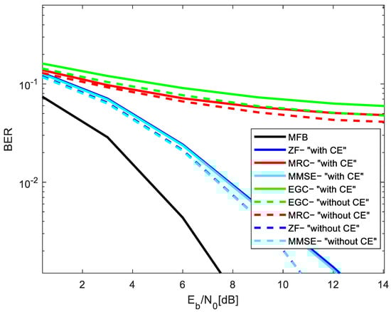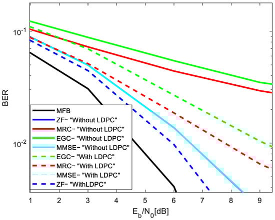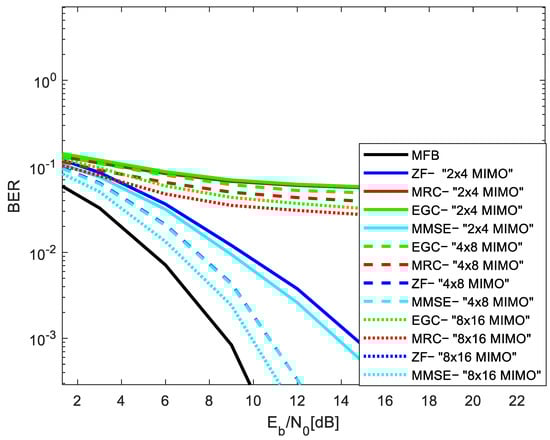 Figure 4 shows the performance results for the D-m MIMO system in different scenarios: 2 transmit antennas and 4 receiver antennas (2 × 4), 4 transmit antennas and 8 receiver antennas (4 × 8), and 8 transmit antennas and 16 receive antennas (8 × 16). All these configurations consider two users, without LDPC codes, being associated with four receiver types: ZF, MMSE, MRC, and EGC. The augmentation of the number of receiving antennas is expected to enhance performance outcomes, while a degradation is expected with the increase in the number of transmitting antennas (corresponding to an increase in the symbols rate). According to the BER information, an increase in T and R shows greater efficiency. The ZF and MMSE demonstrated a performance that is almost on par with that of the Matched Filter Bank (MFB) for 8 × 16 MIMO. Note that the MFB curve can be seen as a lower bound, corresponding to the system without any inter-symbol interference. Moreover, the MRC exhibited somewhat superior efficacy in comparison to the EGC. The advantage of the MRC and EGC relies on their simplicity, as compared to ZF and MRC receivers.