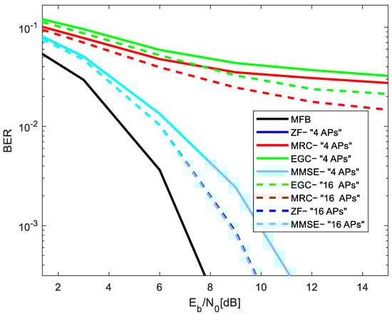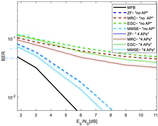 A basic MIMO system without APs and with four APs is shown in Figure 5 for the 8 × 64 MIMO configuration, for four different types of receivers: ZF, MMSE, MRC, and EGC. As before, LDPC codes are not considered in these results. An increase in APs leads to improved performance results. This highlights the importance of considering optimal deployment strategies to achieve the desired BER performance in distributed massive MIMO systems.