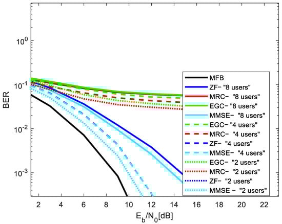 Figure 7 illustrates the performance results of the 8 × 64 MIMO configuration (8 transmit antennas and 64 receiver antennas) with 2, 4, and 8 users, without the use of LDPC codes. As anticipated, increasing the number of users leads to an overall decrease in performance. However, it is noticeable that, in all results, the decline in performance is small for the MMSE and ZF receivers but more noticeable for the MRC and EGC receiver types.