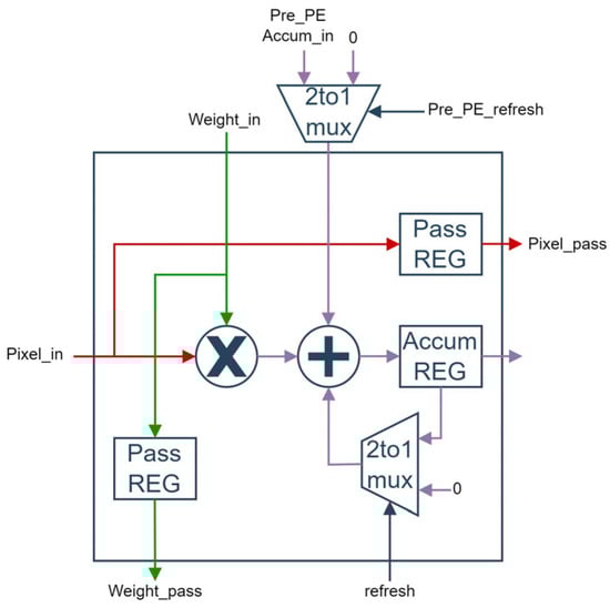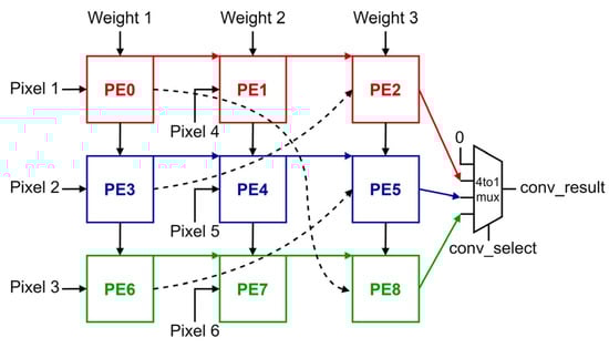 Most of the CNN accelerator architectures use parallel processing element (PE) units, which consist of a multiplier and accumulator (MAC), as shown in Figure 1. A systolic array is a special PE array structure built for the fast and efficient operation of regular array algorithms and to reduce their computation time. The systolic arrays are also effective at reducing memory access by reusing data that have already been passed through other PEs. Therefore, many research works have proposed systolic array architectures to maximize the speed of iterative convolution computations [,,,,,,,,,,,].
