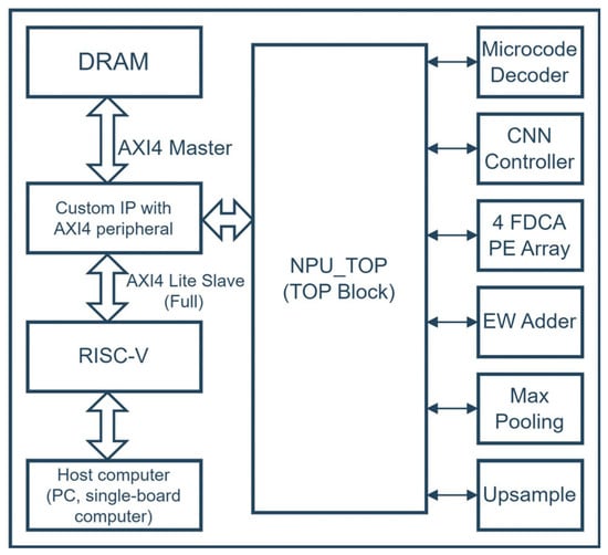 In the proposed architecture, the global input/output buffers are used for sending/receiving data to/from DDR via the 256-bit AXI4 data bus. The proposed architecture includes an additional input buffer called “Instruction Memory”, which is used for writing the instruction microcode from the RISC-V CPU core through the 32-bit AXI4-Lite bus protocol.