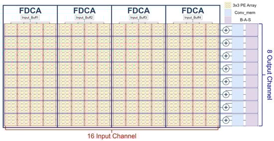 To accelerate the convolution operation, we employ four FDCAs to calculate 16 input data channels simultaneously. The relevant processing architecture is illustrated in Figure 3. The convolutional result generated by a single filter using FDCA is stored in a convolutional memory (Conv_mem). After calculating the convolutional outputs for all input channels, the final result is produced by accumulating them and storing the result in the Conv_mem as the final output.