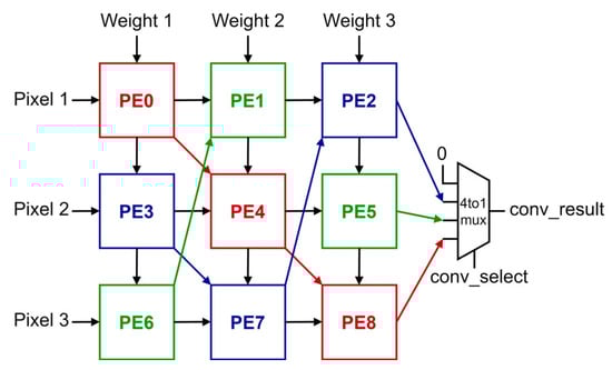 The PE2, PE5, and PE8 perform convolution operations for one input channel by accumulating nine data, including six data accumulated by the Pes of the previous two vertical lines. The last vertical line produces one convolution result in every clock cycle after the first result is produced. Since only one final result is produced in KU for each clock, the conv_select signal is reused to select the results sequentially. The color of each PE and arrow indicates the path of partial sums used to compute one convolution result. The convolution results are repeatedly calculated in the order of red, blue, and green.