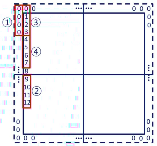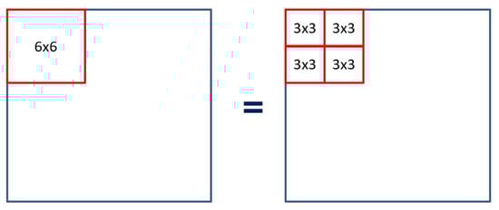 The convolution operation with a 6 × 6 kernel is performed by executing the convolution operation with a 3 × 3 kernel on the KU. Figure 7 illustrates the segmentation of a convolution operation using a 6 × 6 kernel into four 3 × 3 kernels for processing with the proposed design. In this mode, the input feature data for each convolution operation with a 3 × 3 kernel process a dedicated part of the whole input data, with overlapped contents. To calculate the final output of the convolution operation with a 6 × 6 kernel, we use a two-stage adder tree after finishing convolutions in the FDCAs.