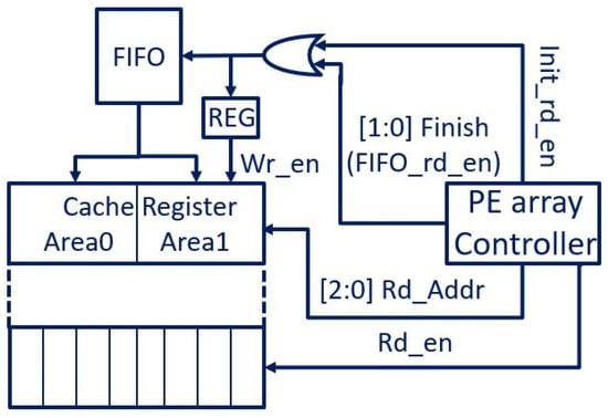 We used FIFO output cache memories to share feature map data between the input FIFO and KU. Each address in the input FIFO contains four feature map data at a moment. Therefore, the FIFO output cache memory block receives four data from FIFO at once, queues them in order, and transfers them to the KU, respectively. Each cache memory consists of eight 16-bit registers and enables the loading of one or two feature map data to the KU. We divided eight 16-bit registers into two parts, named Area0 and Area1, each consisting of four 16-bit registers.