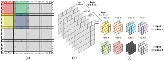 By applying the concept of slicing, we reduce the amount of input data needed for processing in the CNN accelerator at once. As a result, the size of the on-chip memory and computational circuits is effectively reduced. To achieve the aforementioned improvements, this study not only introduced the concept of slicing but also implemented the idea for a limited number of kernels. Figure 10 illustrates how the iteration is defined in our architecture based on the feature map size and slice. When using the concept of slicing in convolution, there is an overlap between two slices. Figure 10a shows that the overlap between slices occurs when using 3 × 3 kernels. Figure 10b,c represent an example of input/output iteration. In this study, because 16 input channels and 8 filters can be used for calculation simultaneously, the number of channels used for one input iteration becomes 16, contrary to what is shown in the figure. Similarly, eight (8) filters are used for convolution processing in each output iteration.