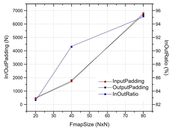 To add padding to the input feature map, most CNN accelerators use a software-based approach before loading the data to the DDR DRAM. In this work, we designed the circuit to add zero padding around the input feature map, a concept known as input padding in the circuit. Using input padding is more effective than using output padding. Figure 11 presents the ratio of input padding storage pixels to output padding based on the size of the input feature map. The figure shows that as the feature map size decreases, the proportion of storage pixels also decreases by up to 82.6%.