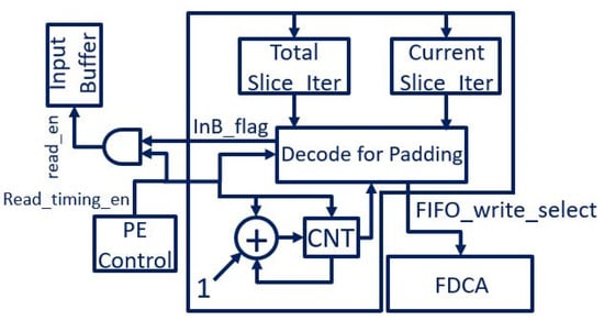 The input padding circuit includes the register and control signal. The first component is the 2-bit padding state register, known as the “FIFO write selection”, which varies depending on the current/total slice iteration and kernel mode (Figure 12). Table 1 and Figure 13, along with the description below, explain the adding-zero-padding method for each case.