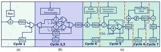 In this study, we targeted the YOLOv5n model and quantized the model to an integer representation. Thus, we designed an extra circuit to calculate bias, activation, and scaling parameters for converting the final convolution result into the feature map for the next layer. Figure 14 illustrates the bias–activation–scaling (BAS) pipeline architecture used in the proposed SoC hardware. All parameters, bias, activation, and scaling parameters are represented as 16-bit integers, allowing for a fast and low-cost area architecture. The pipeline process consists of six stages and requires seven cycles to process one piece of data.
