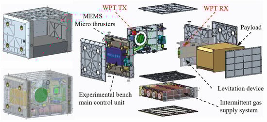 As shown in Figure 1, the levitating experiment platform adopts a square structure with a highly integrated design concept. It mainly consists of components such as the experimental bench main control unit, WPT, MEMS micro-thruster, intermittent gas supply system, main power line, payload and camera. In order to power the levitating experiment system, the high microgravity experiment cabinet adopts WPT technology, replacing the potential hazards associated with traditional umbilical cord power supply processes. The transmitting coil for WPT is fixed on the high microgravity cabinet, while the receiving coil is dependent on the levitation device. This configuration enables contactless and force-free transmission.