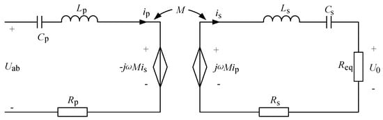 Figure 2 illustrates the most basic series–series compensated topology of the WPT system, in which represents the voltage across the terminals of the transmitting coil, is the mutual inductance between the two coils, is the load, and are the effective values of the currents in the transmitting and receiving coils, and are the internal resistances of the two coils, and are the self-inductances of the transmitting and receiving coils, and are the compensation capacitors for the transmitting and receiving coils and is the switching angular frequency of the inverter.
