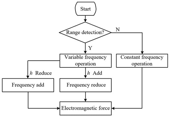 Figure 3 is a flowchart of frequency control. When the transmission distance changes, adjusting the system’s switching frequency alters the phase difference to minimize the electromagnetic-force on the receiving coil. To measure the position changes of the receiving coil, three sets of laser ranging sensors are employed. Each set measures one degree of freedom of the coil’s position, providing changes in the coil’s motion along the , and axes. The position data obtained from the receiving laser displacement sensor provides the position , , of the coil during motion.