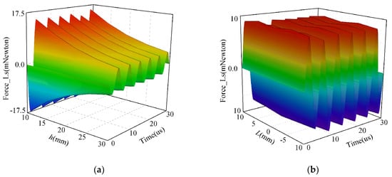 In Figure 14a,b, it can be observed that at a transmission distance of , the electromagnetic-force on the receiving coil is repulsive, and the electromagnetic-force is about , with a switching frequency of . When the eccentricity is , the electromagnetic-force is about , and the system’s switching frequency is .