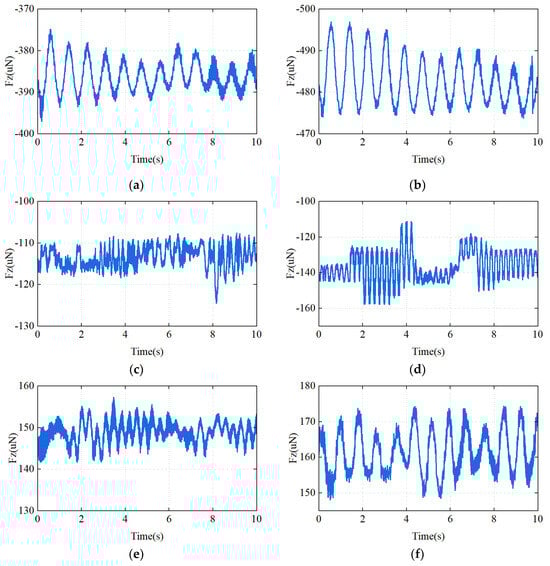 In Figure 14e,f, it can be observed that at a transmission distance of , the electromagnetic-force on the receiving coil is attractive, and the electromagnetic-force is about , with a switching frequency of . When the eccentricity is , the electromagnetic-force is about , and the system’s switching frequency is .