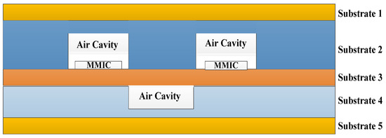 The composite laminate with a permittivity of 3.0 and a dielectric loss tangent of 0.0011 is used as the substrate. It shows the features of low dielectric loss and low gassing rate. Figure 2 shows the 5-layer SISL structure in our design, which consists of five PCB layers. The core RF circuits and MMICs are designed and assembled on the third substrate layer. The second and fourth substrate layers are hollowed out to form air cavities for the suspended strip line. The first and fifth layers are used as cover plates for the cavity. The metal layer at the bottom of the first substrate and the top of the fifth substrate, as well as the metalized holes surrounding the cavities that connect the first and fifth layers, form a shielding structure for the suspended stripline, which realizes the self-packaging structure, reduces the radiation loss, and shields the electromagnetic wave effectively.