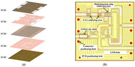 The proposed Ka-band two-channel two-beam receiver module based on SISL works in 28~30 GHz. It contains five substrate layers named sub1~sub5, as illustrated in Figure 3. Sub3 is the core RF layer where MMICs, including the LNA, two-channel multi-functional chips with amplitude and phase control, and transition circuits are integrated.