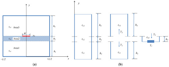 The SISL circuit is based on a suspended stripline, whose cross-section is illustrated in Figure 4a. The area 3 and 1 are air with permittivity of εr3 = εr1. The area 2 is the dielectric substrate. The transmission mode in SISL can be considered as quasi-TEM mode. The transmission characteristic of SISL can be derived from solving the distributed capacitance of the transmission line. The solution of the capacitance can be calculated using the variation method and Green function. The Green function can be derived from solving the effective circuit of the transmission line along the Y direction [20]. Here, we consider the SISL model in Figure 4a as a transmission line along Y direction, where the distribution of the electromagnetic wave is a standing wave. The effective circuit of the SISL along Y direction is shown in Figure 4b. It can be considered as a short-circuit line as the SISL is in a metal shielding cavity.