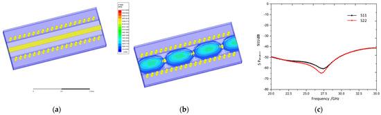 A SISL simulation model is built in HFSS. The simulation results show that the electric field is confined and transmitted in the air cavity surrounded by grounding via holes, as shown in Figure 5b. This validates the good inter-channel shielding performance. The return loss of the SISL is better than 40 dB over 20 GHz~35 GHz, as shown in Figure 5c.