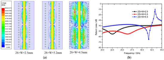 The influence of the change of 2S + W on the RF performance of SISL. (a) Field distribution, (b) return loss.