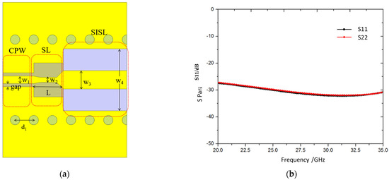 The RF signal is mainly transmitted along SISL in our design. In practice, the inner transmission line needs to transit to the coplanar waveguide for testing and interconnection with other modules. The transition structure consists of SISL, SL, and CPW [21]. The characteristic impedance of these three types of transmission lines is set as 50 Ohm. However, the width of the 50 Ohm-transmission line is different in different types of transmission lines, which makes it easy to generate reflection waves at transition points, leading to degradation of voltage standing wave ratio (VSWR). So the transition structure needs to be optimized at the transition point among SISL, SL, and CPW. As the reflection wave may couple to other substrate layers and cause resonance, the optimization of the transmission needs to consider the location of the SL layer as well. The model of the proposed CPW-SL-SISL transition and its simulation results are shown in Figure 8. The dimension of the transition is shown in Table 2.