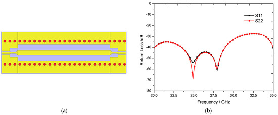 The transition circuit exhibits good matching and transmission performance in the working bandwidth of 20~35 GHz. The return loss is better than 25 dB, as shown in Figure 8. A back-to-back transition model is also built and analyzed, as shown in Figure 9. Return losses of better than 27 dB are observed at two ports in the frequency range of 20~35 GHz, which shows good transmission performance.