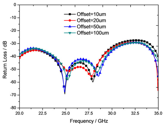 Wafer stacking is a crucial step in the implementation of SISL circuits, involving the vertical assembly and fixation of multiple substrate assemblies with integrated chips using appropriate methods. During substrate stacking, precise positioning and fixation of the substrates are required to ensure that the vertical interconnection points between layers are aligned accurately in three-dimensional space. However, when the five-layer dielectric substrates are assembled, there will inevitably be certain positional deviations between each layer, which makes it difficult to form effective vertical interconnection, leading to a deterioration of the RF performance. To address this issue, non-metallic positioning holes are machined at the same position on each layer of the dielectric substrate, and positioning is done using dowel pins before welding assembly. This can minimize the positional deviations between the layers. The typical value for alignment accuracy is 30 μm. The impact of misalignment in the positioning of the five-layer boards on RF performance is simulated, as shown in Figure 11. When deviations change from 10 μm to 100 μm, the return losses remain better than 27 dB, which shows a negligible effect on the RF performance.