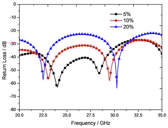 The thickness of the PCB substrate may have certain deviations between different batches (typically within 10%). These thickness differences have a relatively minor impact on circuit designs in the low-frequency range. However, when the working frequency rises to the millimeter-wave frequency range where wavelengths are very short, the accumulation of these errors may lead to deterioration in the overall performance of the circuit. Here, an analysis of the impact of substrate thickness deviation on the RF performance of the circuit is conducted, as shown in Figure 12. The RF performance of the circuit is simulated under thickness deviations of 5%, 10%, and 20% at the main circuit layer with a nominal thickness of 0.254 mm. It can be observed that within a thickness deviation of 10%, the return loss is maintained better than 27 dB. Even under a thickness deviation of 20%, the return loss is still better than 20 dB.