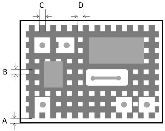 Grounds pattern in grid design. A is the gap between the edge of the substrate and the metal ground. B is the gap between two metal ground strips in the y direction. C is the width of the metal ground strip. D is the gap between two metal ground strips in the x direction.