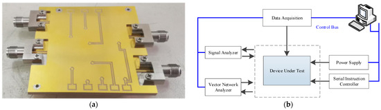 The assembled two-channel two-beam receiver module is shown in Figure 14a. As it is self-packaged, no external metal cavity is needed. The dimension of the module is 55 mm × 55 mm × 1.8 mm. The setup to measure the receiver module is shown in Figure 14b. The power supply provides +5 V DC voltage to drive the active components in the module. A serial instruction controller controlled by the computer sends instructions to control the attenuation and phase shifting in each channel. The gain and the manipulation of the attenuation and phase shift are measured with an S-parameter testing using a vector network analyzer (VNA). The NF is measured by the signal analyzer. The root mean square resolution of amplitude and phase control is acquired via post-processing of attenuation and phase shifting data.