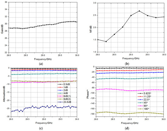 In the S-parameter test, firstly, the VNA is calibrated in the frequency range of 28~30 GHz to calibrate the error and losses in the test equipment and RF cable. Then, the receiver module is connected to the test setup, as shown in Figure 14b. The single-channel ground-state gain, where the digital control attenuator is set as 0 dB, is shown in Figure 15a. The in-band receiving gain exceeds 28 dB in 28~30 GHz range. The control of attenuation and phase-shifting is shown in Figure 15c,d. The attenuation can be adjusted from 0.5 dB to 23.5 dB with an increment of 0.5 dB. The phase shift of the module can be changed over 360° with a step of 5.625°. The RMS resolution of attenuation and phase shifting are 1 dB and 4°, respectively.