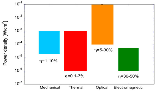 Energy harvesting aims at converting into electrical the energy available in the environment from sources otherwise wasted, including optical [2], mechanical [3], thermal [4], and electromagnetic [5] sources. Its potentials clearly depend on the source intensity and the achievable conversion efficiency (i.e., the ratio between the electric power output and the total power input from the relevant energy source). Typical values are reported in Figure 1 for the most relevant cases [1,6,7,8]. Mechanical power densities are available between 20 µW/cm2 and 1 mW/cm2, with corresponding conversion efficiencies from 1 to 10%. Thermal sources can provide intensities of up to 1 mW/cm2, but only less than 3% can be converted into electric power. Electromagnetic power densities are even lower (1 to 50 µW/cm2), but the obtainable conversion efficiency can reach 50%. Optical sources provide much larger densities from 0.1 to 100 mW/cm2, resulting in harvested energy with conversion efficiencies from 5 to 30%.