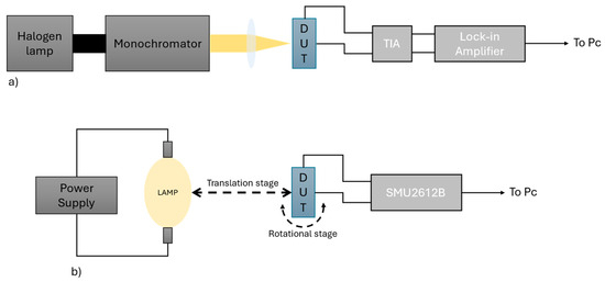 Sketch of the measurement setups for (a) the spectral response and (b) the I–V curves. In (b), the lamp source can be either halogen, LED, or fluorescent.