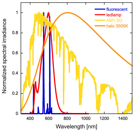 The spectral responses were acquired with a calibrated setup based on a Horiba Micro-HR spectrometer and a Stanford SR830 lock-in amplifier. The I–V curves and the PCE were obtained through current–voltage characteristics measured with a KEITHLEY 2612B. The employed light sources were a Lot Oriel class AAB AM1.5G solar simulator; an OSRAM-64628, 3500 K; a 50 W halogen lamp; an OSRAM Lumilux 50 W 4800 lmn fluorescent tube; and a warm Philips (3000 K) 7.3 W LED lamp. The spectral irradiances of the LED and the fluorescent lamps were quantified with the aid of the OCEANINSIGHT Flame-S-VIS-NIR portable spectrometer, the solar spectrum was the ASTM G-173 Air Mass 1.5 G [23], and the halogen lamp spectrum was calculated using the Planck radiation law. The corresponding normalized spectra are displayed in Figure 4.