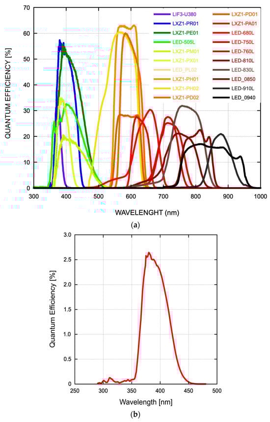 The SQE values are graphed in Figure 5a,b. The SQEs were determined as the ratios between the number of electrons extracted from each LED and the number of impinging photons at a specific wavelength. As expected, the SQEs exhibited varying characteristics in terms of highest value, peak wavelength, and bandwidth, with a cutoff close to the LED emission wavelength. The peak SQEs ranged from a minimum of about 20% to a remarkable maximum of above 60%.