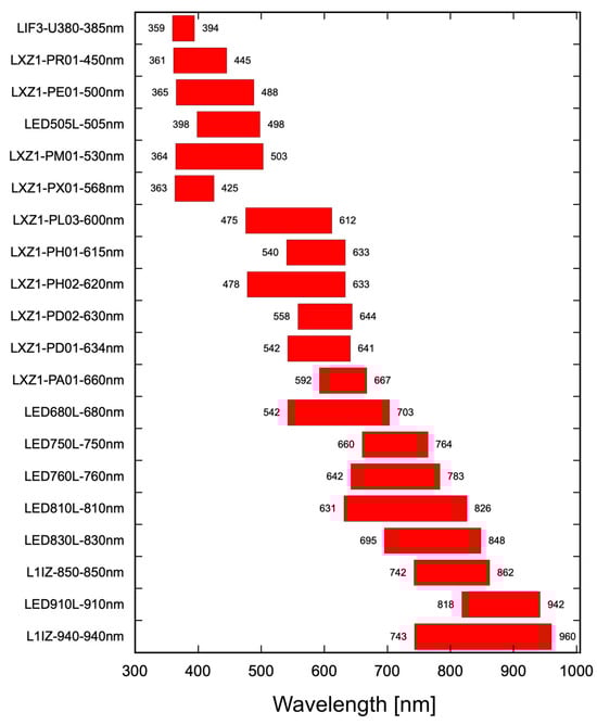 LEDs are available for emission at several wavelengths, resorting to different semiconductors, types of band-gap engineering, and architectures. In our study, we selected 20 LEDs operating in the range from 380 to 940 nm and investigated their performance in terms of spectral quantum efficiency (SQE) and power conversion efficiency (PCE). We also included the white LED K691B, which is a device typically employed for indoor lighting and based on a blue-emitting LED covered with a phosphor. All the selected LEDs are off-the-shelf commercial types with a 1 mm2 junction area, except the white LED, which has a round surface of diameter 3 mm. The complete list of characterized LEDs is presented in Table 1.